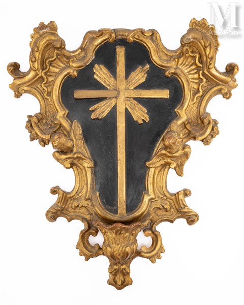 En bois sculpté et doré, de forme violonnée à décor rocaille épaulé de larges coquilles, surmontant deux putti. Au centre, la croix dressée sur fond noir, et la coupe recevant l'eau bénite au pied.
