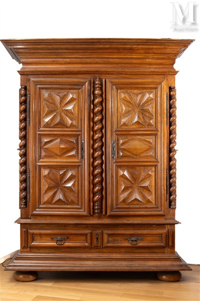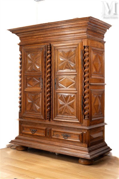 Importante armoire Noyer mouluré, sculpté et tourné, ouvrant à deux portes en...