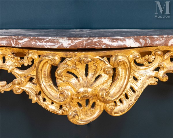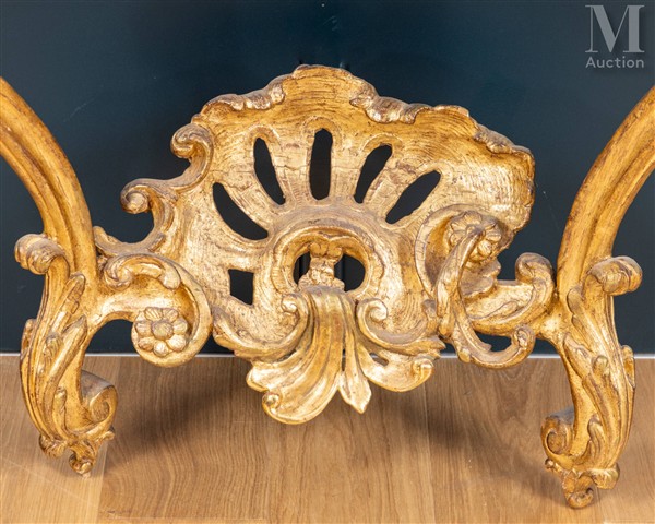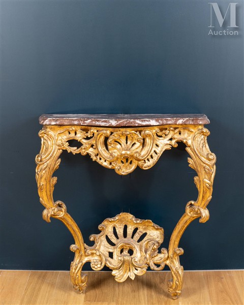 Console d'époque Louis XV En bois sculpté et doré, la ceinture chantournée à...