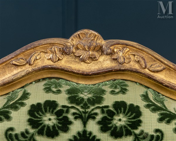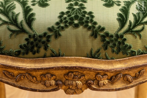 En hêtre mouluré, sculpté, à dossier plat à la reine violonné centré d’un motif de fleurs orné de feuilles d’acanthe aux épaulements, la ceinture chantournée repose sur quatre pieds cambré à décor de fleurettes sur fond de treillage.