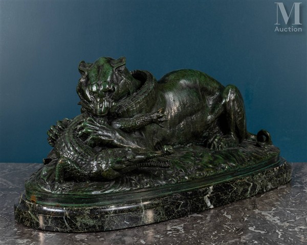 Icône de la sculpture animalière au XIX ème siècle, le modèle original du Tigre dévorant un gavial fut présenté au Salon de 1831 où il reteint toute l'attention par son tourment expressif, tandis que Delacroix présentait cette année-là la Liberté guidant le peuple. Les critiques firent alors de Barye le sculpteur romantique par excellence.