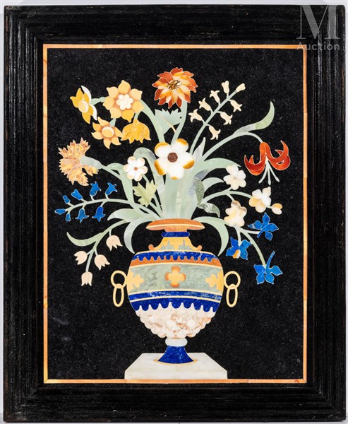 Plaque en marbre noir de Belgique à décor d'un vase fleuri en incrustations de pierres dures dont lapis lazuli, aventurine, cornaline, etc.