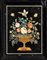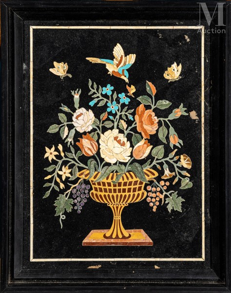Plaque en marbre noir de Belgique à décor en incrustations de pierres dures polychromes d'un vase fleuri entouré d'un oiseau et de deux papillons.