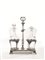in argento, base di forma rettangolare poggiante su quattro piedini a zampa ferina, porta ampolle tripode, fusto lievemente a balaustro, completa di ampolle, alt. cm 27, g 580, un’ampolla con tappo danneggiato