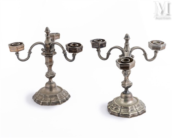 En métal argenté, à trois feux garnis de bobèches hexagonales, le fût de forme balustre reposant sur piédouche à bords découpés.