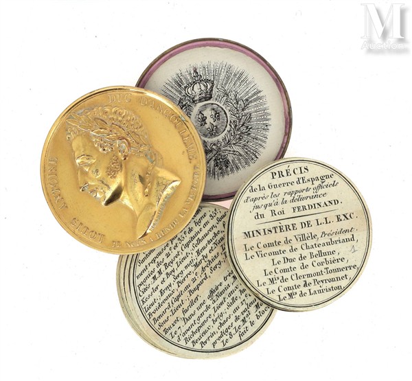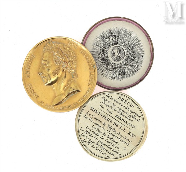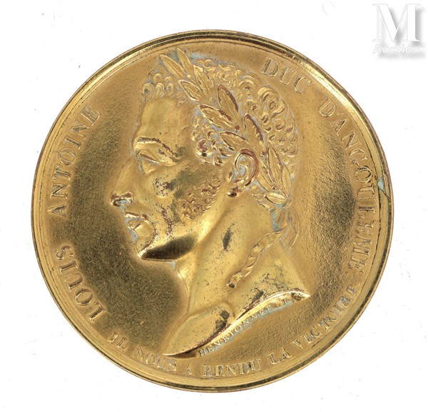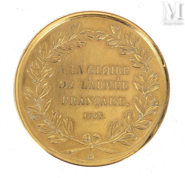Ottone dorato impresso sul dritto con una testa laureata a sinistra del duca d'Angoulême di F.HENRIONNET, con le parole "Ci ha dato la vittoria", e sul rovescio con le parole "Alla gloria dell'esercito francese 1823" inscritte in una corona d'alloro.