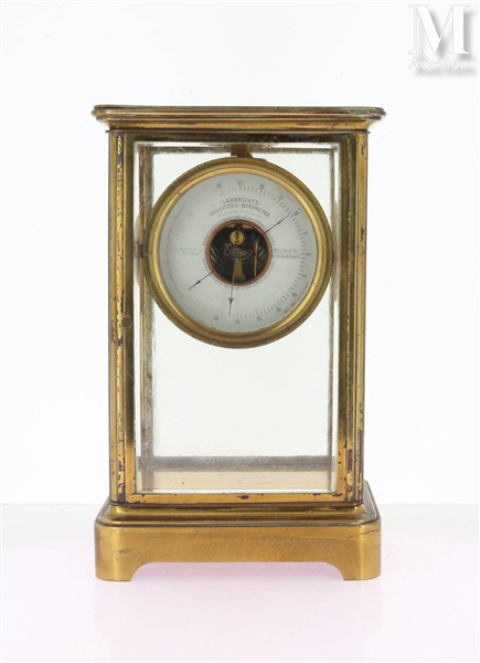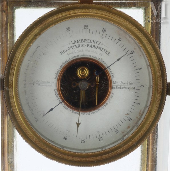 Laiton ciselé à motif de frises de perles et de piastres, ceignant un cadran annulaire imprimé, signé de Lambrecht (Lambrecht's Holosteric Barometer), le centre dévoilant l'intérieur du mouvement.