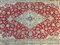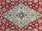 Campo rosso ciliegia decorato da volute di palmette di fiori e fogliami stilizzati che incorniciano un medaglione centrale avorio e azzurro con composizione di fiori a forma di diamante allungato.