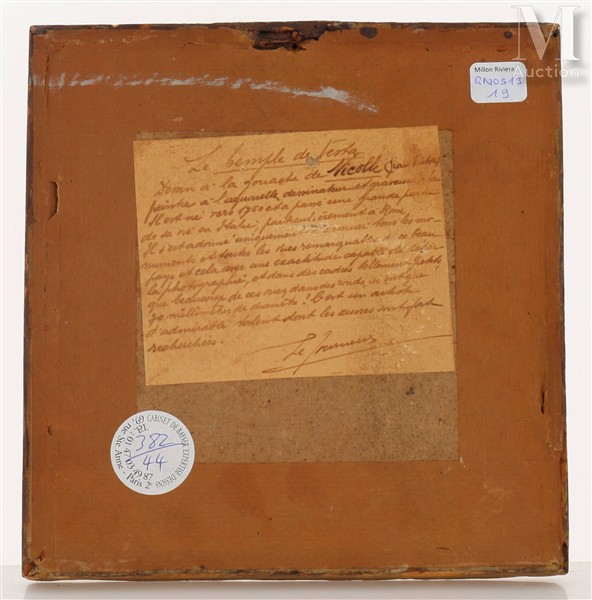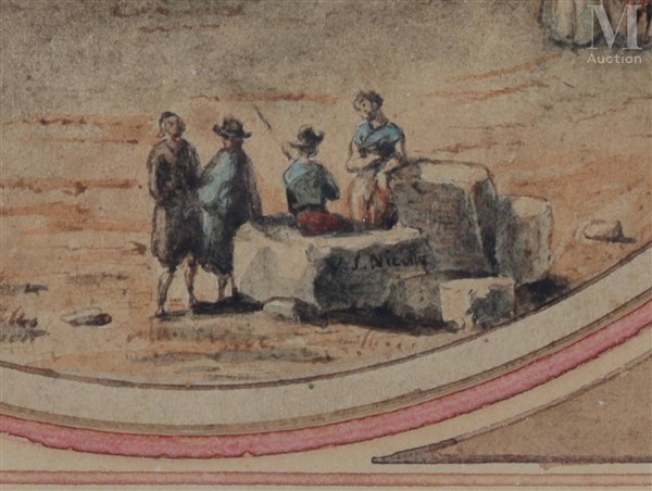 Le musée des Beaux-Arts de Rouen conserve une Vue du temple de Vesta par Nicolle (RMN, Musée des Beaux-Arts de Rouen, Inv. n°964.4.49), d'un format rectangulaire plus grand et centré sur la même face du temple depuis le forum que le dessin ici présenté, dont on retrouve le couple en partie droite. Le nôtre présente toutefois une petite scène supplémentaire au premier plan, réunissant quatre figures masculines conversant adossés à des pierres et rappelant ainsi la passion de XVIII ème siècle pour les paysages de ruines.