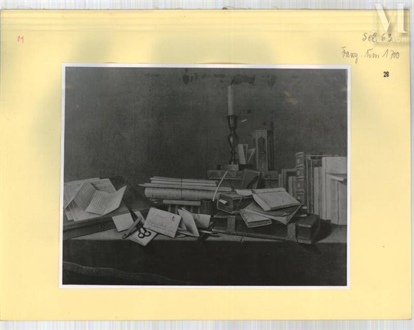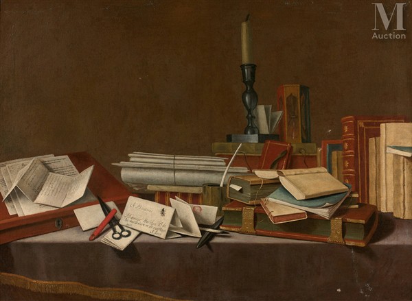Nature morte aux livres et documents manuscrits sur un entablement