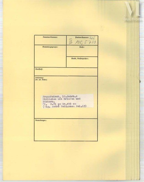 - Ancienne collection du marchand André Seligmann (1898-1945), 128 rue du Faubourg Saint-Honoré à Paris, spoliée aux premiers mois de l’occupation par les nazis. L’œuvre fut envoyée à l’été 1940 à l’Ambassade du Reich à Paris, transférée au Louvre en novembre de la même année, puis successivement au Jeu de Paume où Rose Valland en fit l’inventaire, à l’abbaye de Buxheim et enfin au Château de Neuschwanstein. Ce dernier lieu servit de dépôt à l’ERR où 21 903 objets d'art spoliés, dont 5 281 tableaux, furent entreposés et une partie transférée ensuite dans des mines de sel. Après-guerre, l’œuvre ici présentée, alors décrite comme une école française c. 1700, fut restituée à la famille Seligmann.