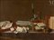 Natura morta con libri e documenti manoscritti su una trabeazione