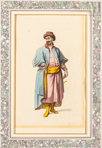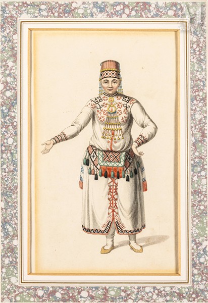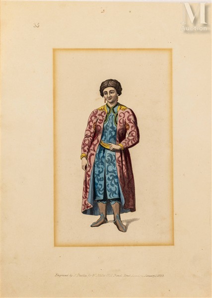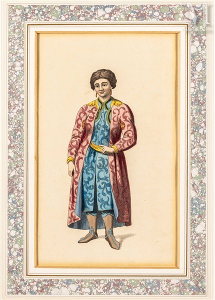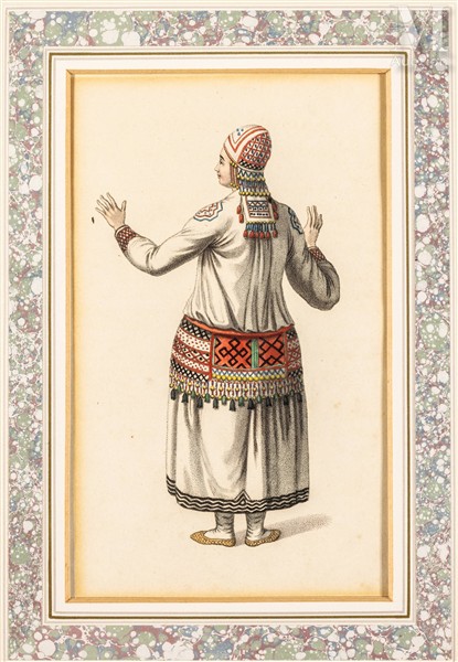 Set di 6 incisioni a colori tratte dall'omonima opera di William Alexander e John Dadley, rappresentanti i costumi tradizionali delle regioni russe dell'inizio del XIX secolo.