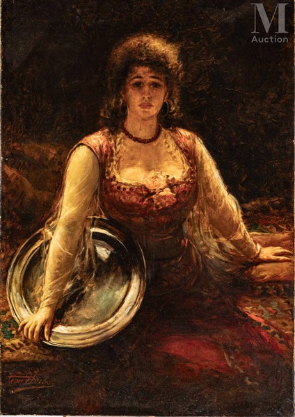 Léon HERBO (1850-1907) Portrait de femme à la robe rouge Huile sur toile...