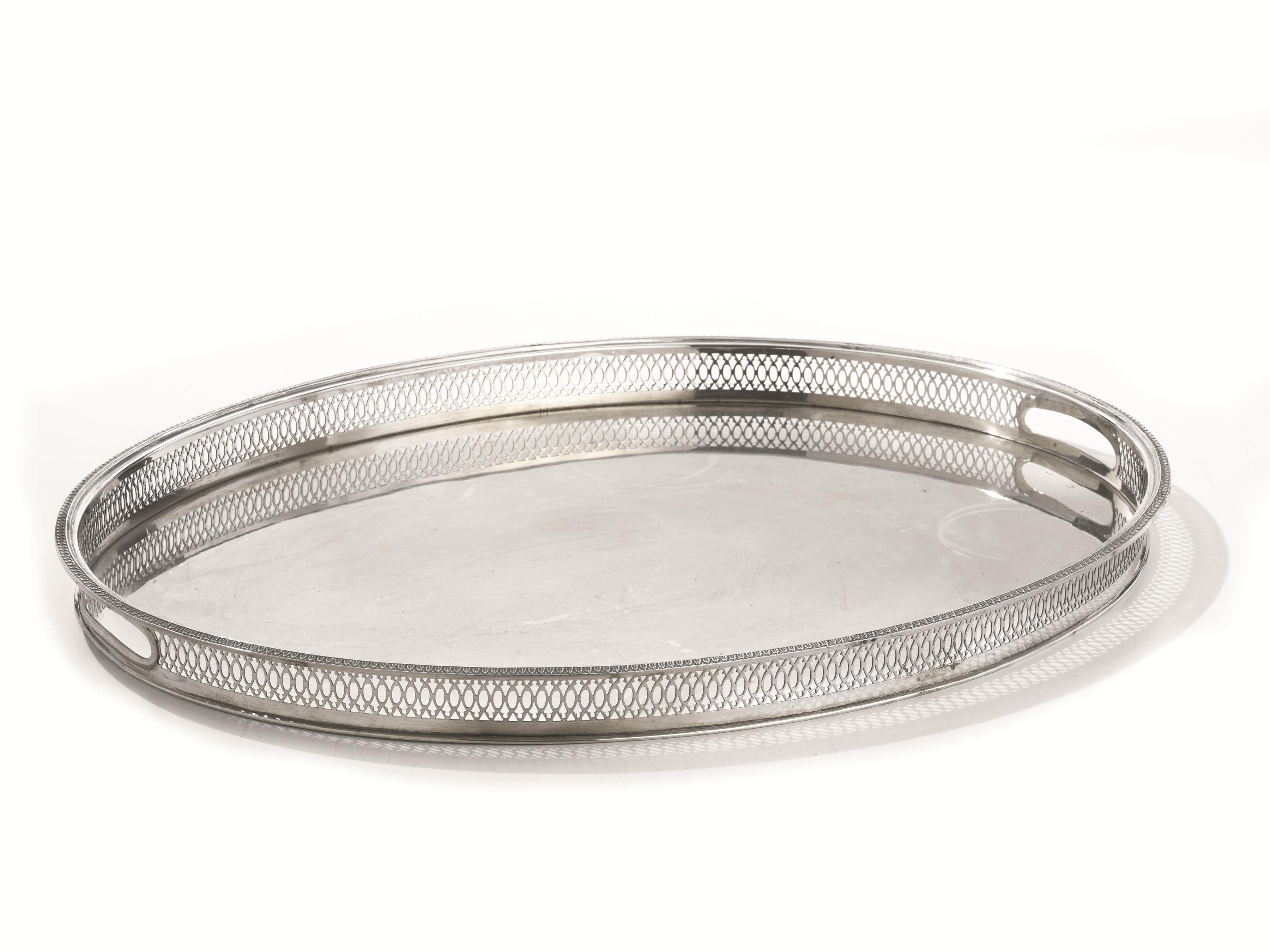 di forma ovale, in argento con bordo traforato a ringhierina, cm 50x39,5, g 1780