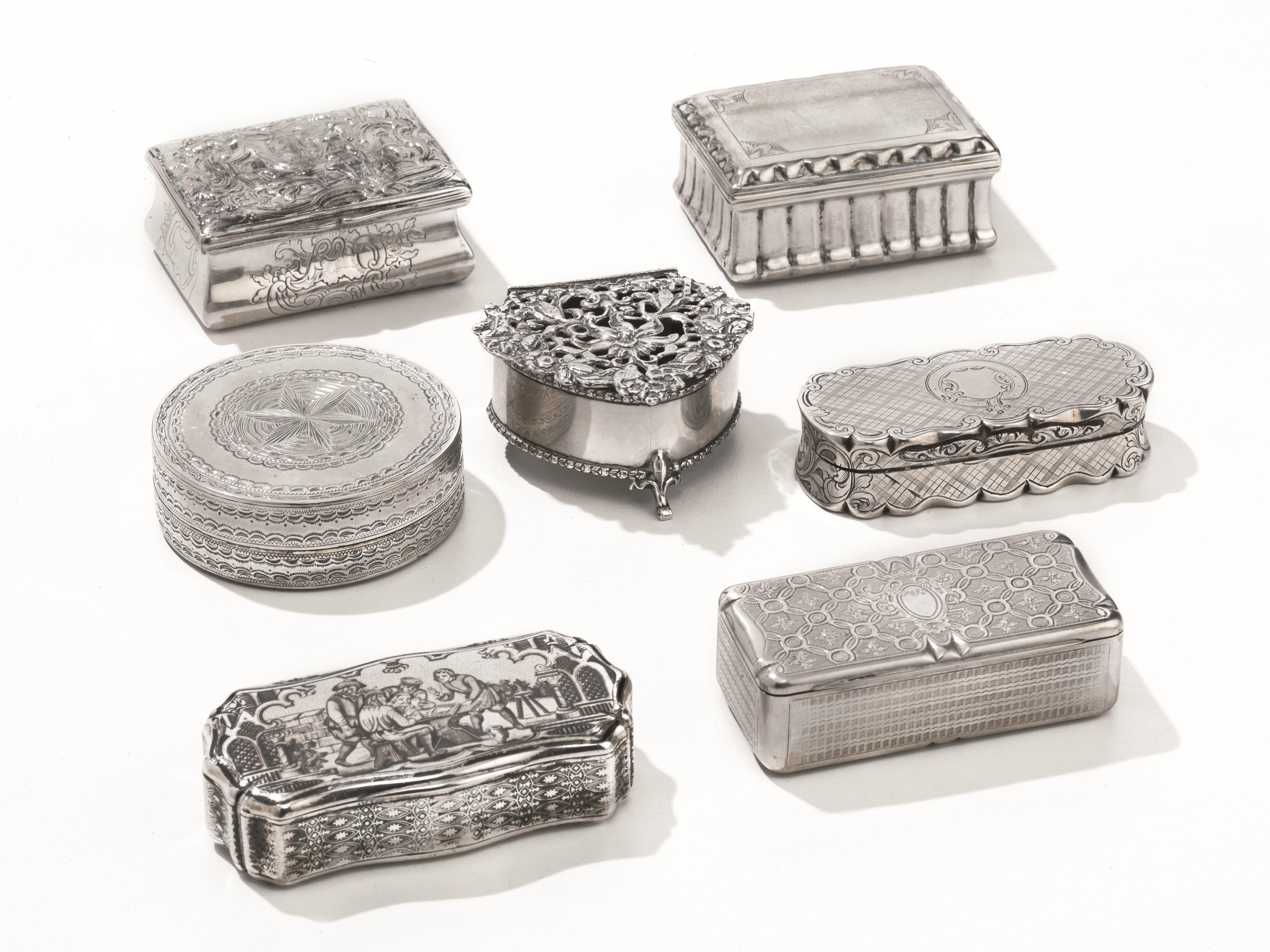 Lot 544 | Sette scatoline, SEC XIX in argento traforato, decorato a niello e inciso, g...