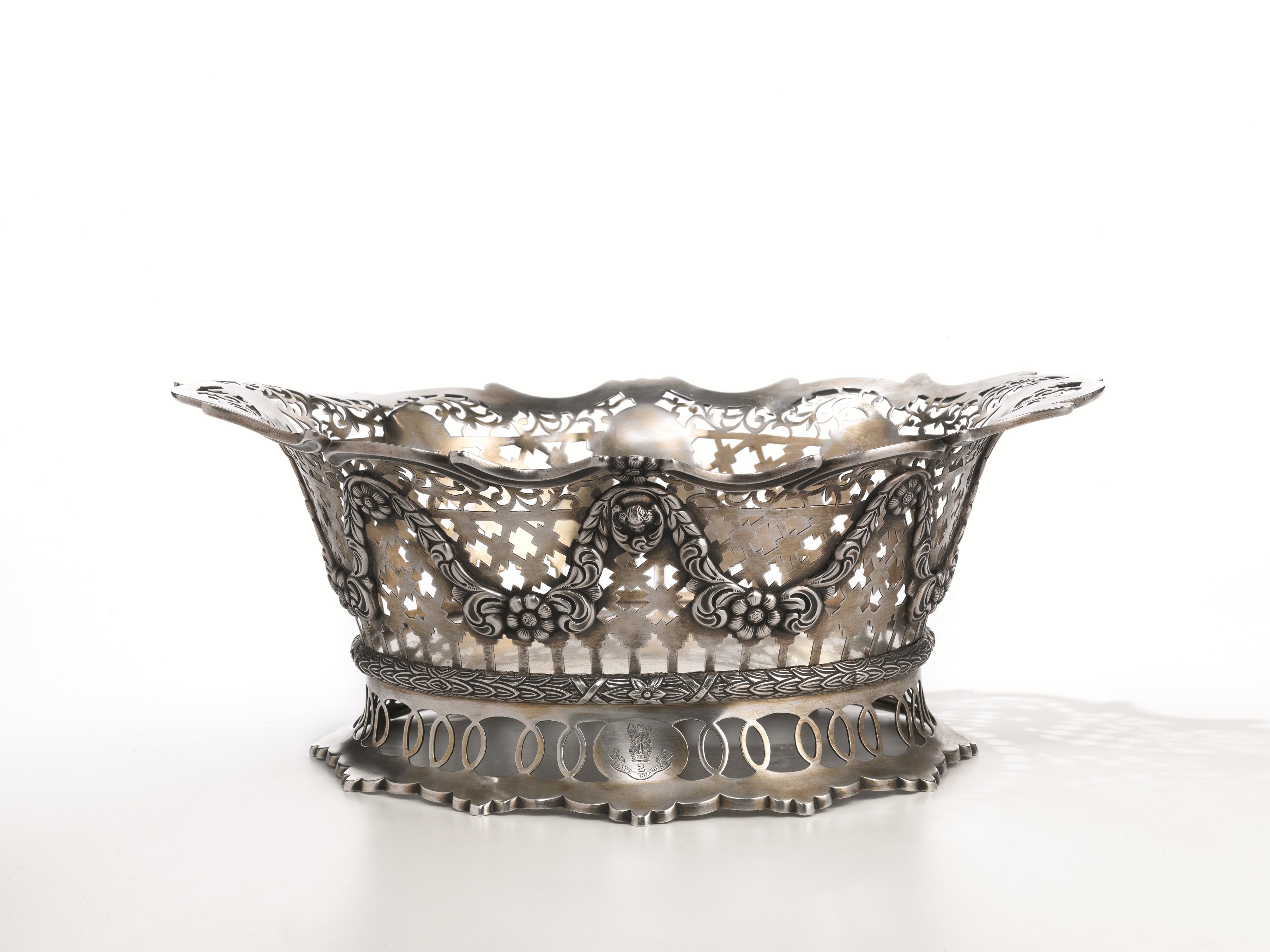 in argento, di forma ovale, ampia tesa traforata e decorata da festoni di fiori, base sagomata, cm 31x42, g 3255