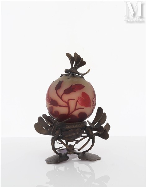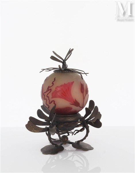 Rare veilleuse à monture et bouchon en métal ouvragé et patiné à décor de libellules.