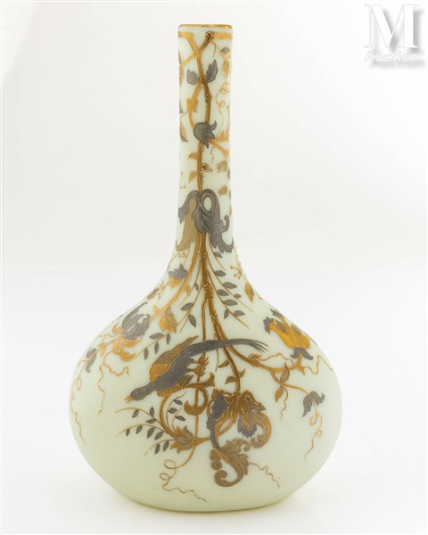 Vase en verre opalin blanc à panse aplatie et long col droit à décor émaillé or et argent de végétaux et d’oiseaux stylisés.