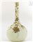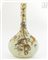 Vaso in vetro opalino bianco con corpo appiattito e lungo collo dritto con decoro a smalti in oro e argento di piante e uccelli stilizzati.