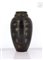 Rame martellato, decorato con forme sinuose e fregi nella parte superiore, intarsiato, dorato e patinato. Il colletto rigonfio.