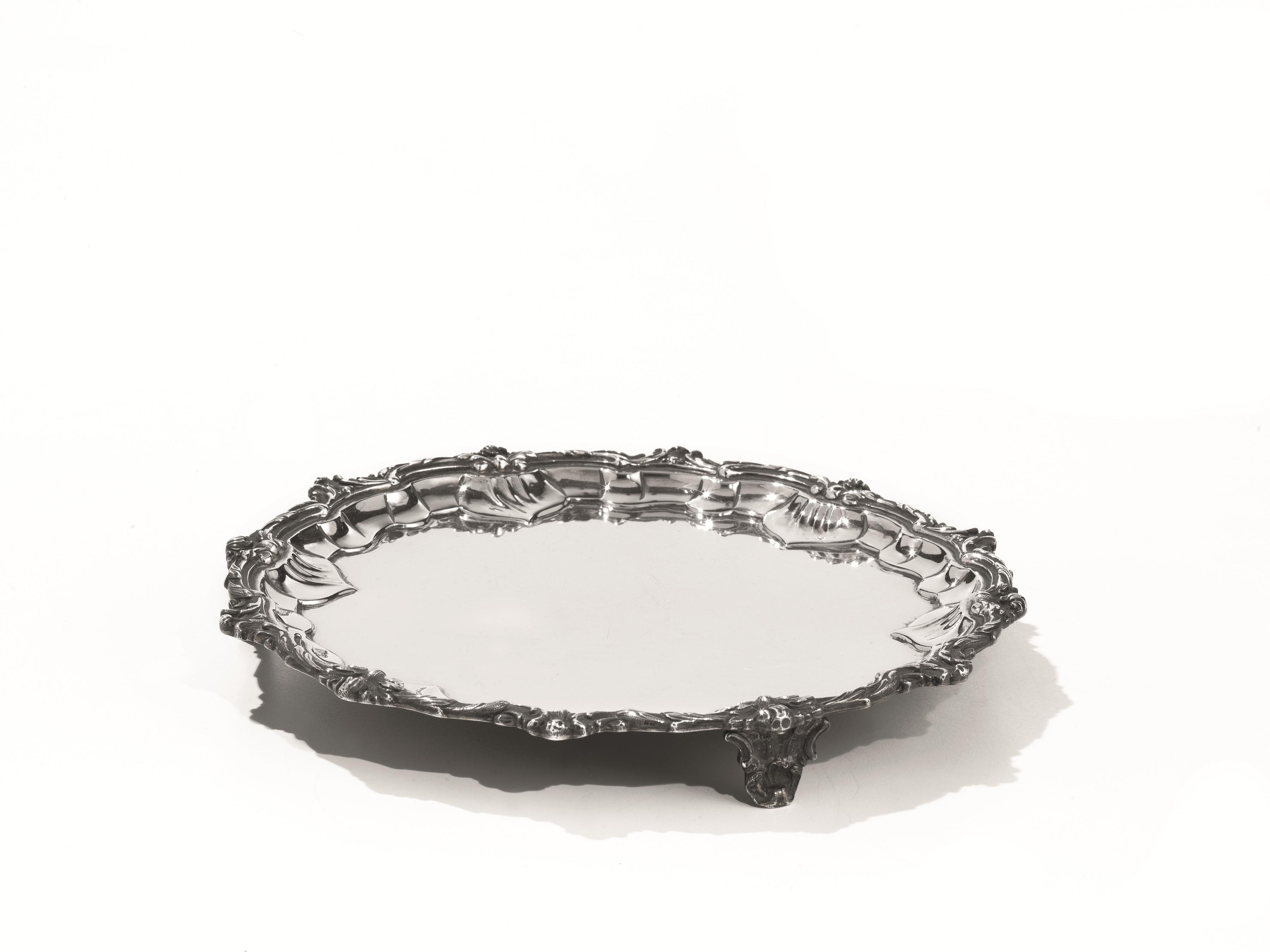 di forma circolare, in argento con bordo sagomato, tre piedini a volute, diam. cm 24,5, g 580