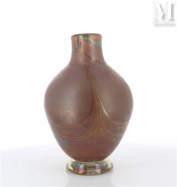 Verre soufflé brun et décor abstrait de rehauts d’or, reposant sur piédouche circulaire en verre transparent irisé.