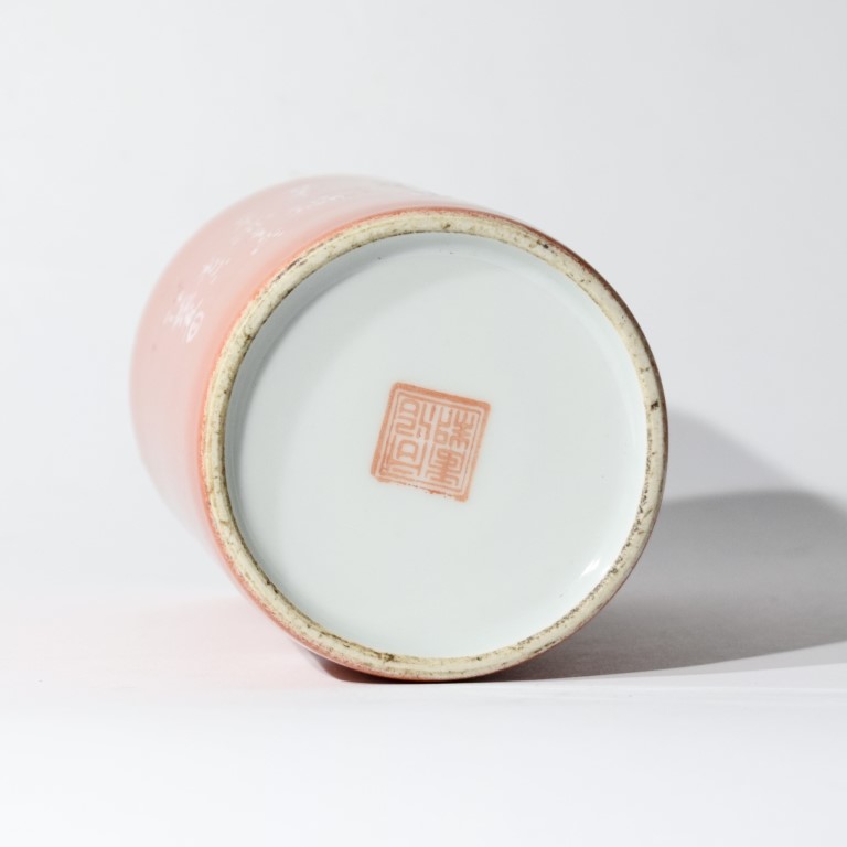 A cylindrical bitong decorated with white flowers and inscriptions on a coral ground. On the bottom iron red seal mark.