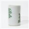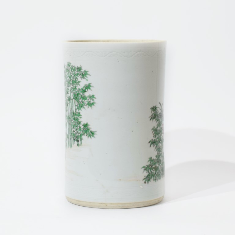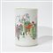 Cylindrical porcelain brush pot decorated with figures in a garden.