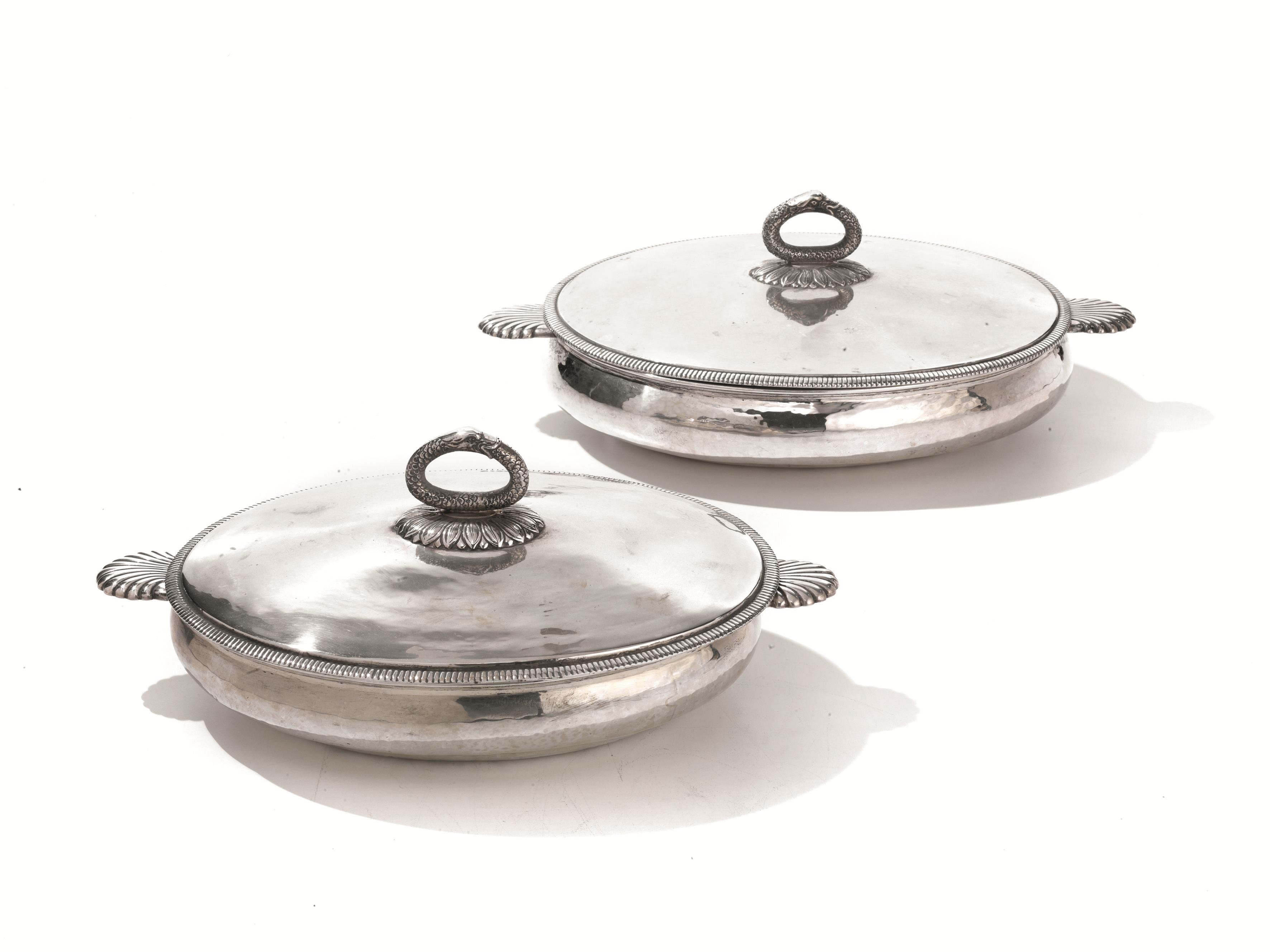in argento di forma ovale, due anse modellate a foglie, prese dei coperchi realizzate come un serpente, cm 22x37, g 2190 (2)