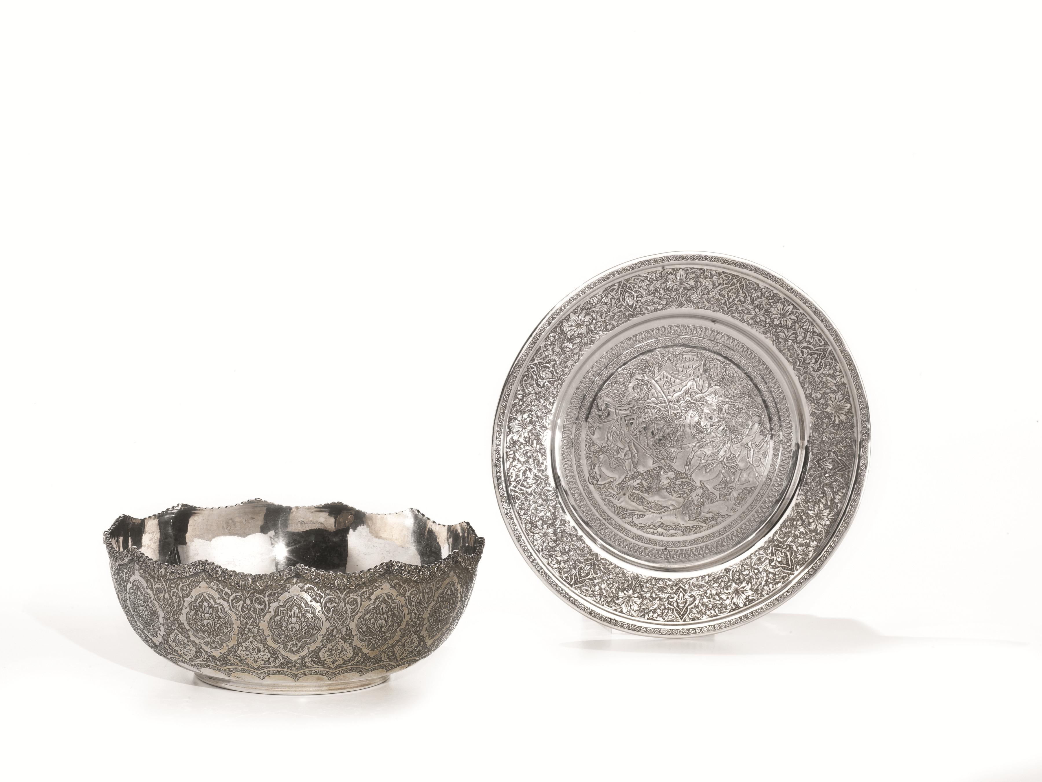 COPPETTA E PIATTO, PERSIA, INIZI SEC. XXin argento finemente cesellato ed...