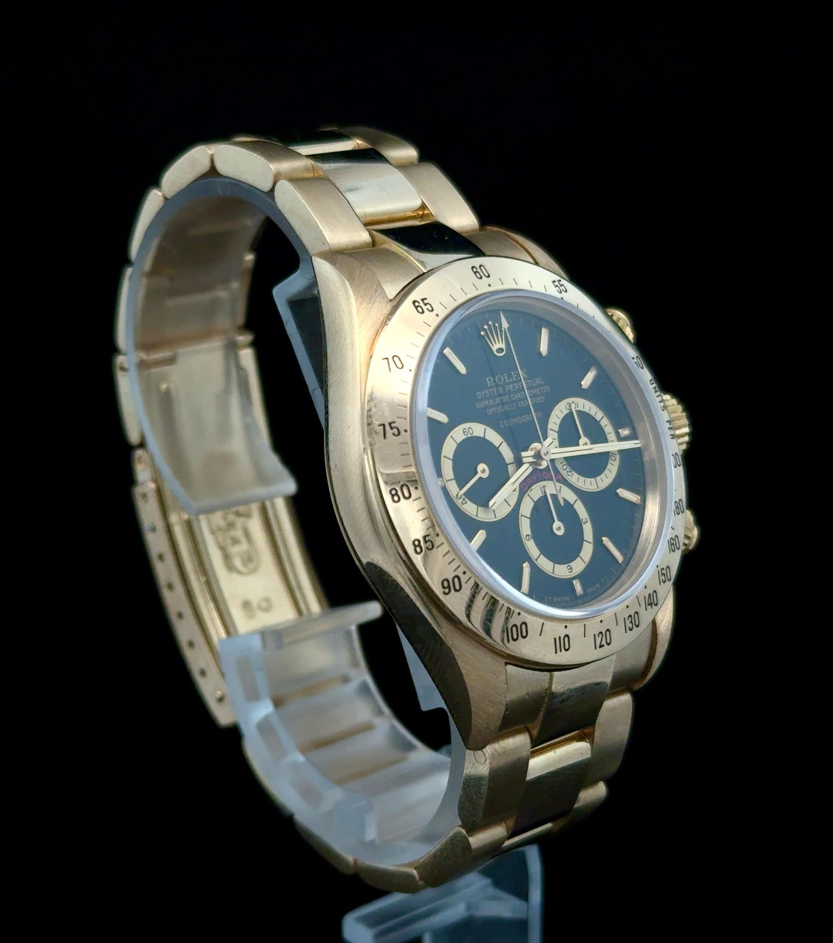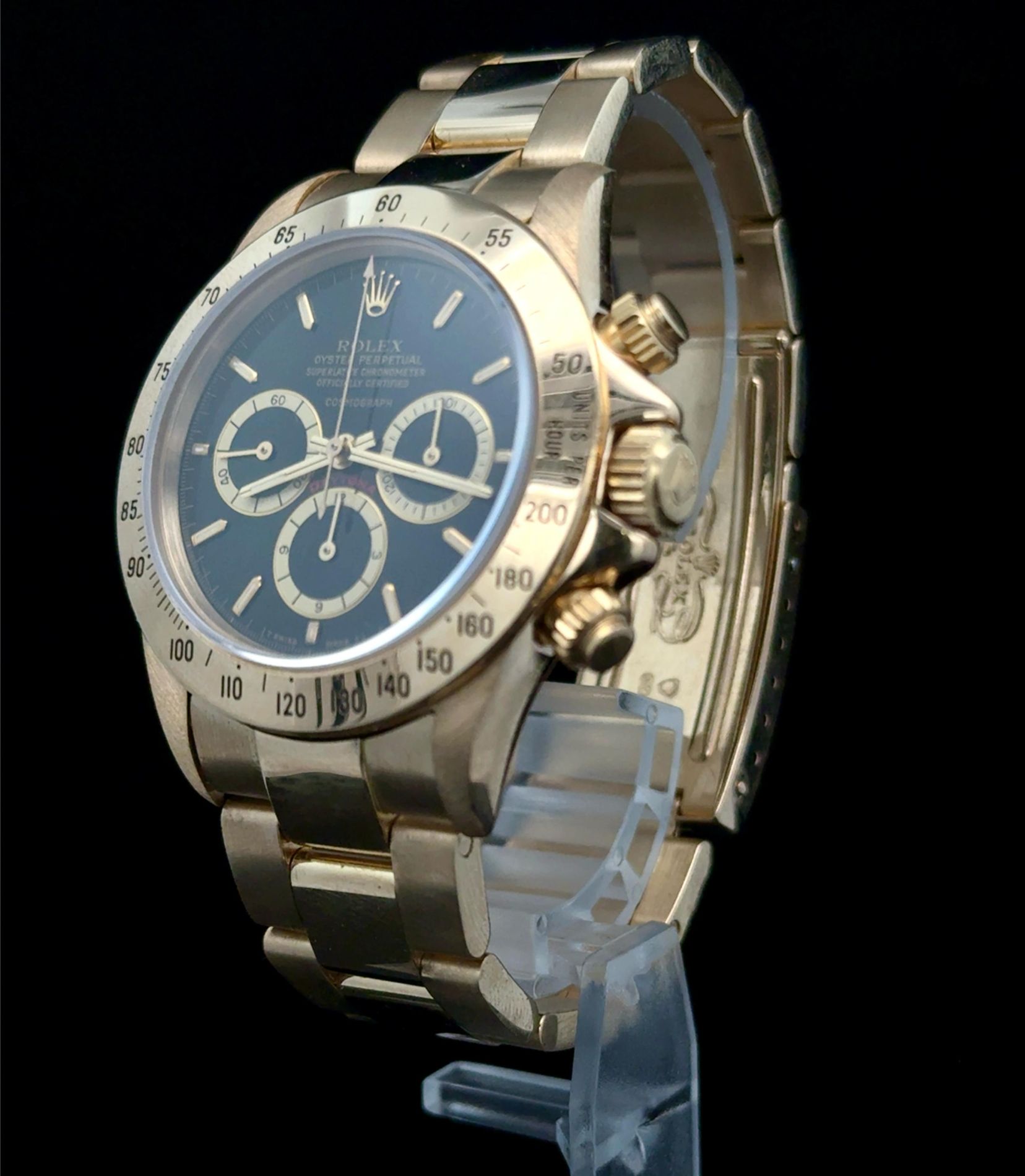 Marca Rolex Modello (Orologio) Daytona floating dial Numero di referenza 16528 Carica Automatico Materiale della cassa Oro giallo Materiale cinturino Oro giallo Anno di produzione 1989 Condizione Usato (Ottimo) Corredo Senza scatola originale né documenti originali Carica Automatico Calibro di base Zenith El Primero Materiale della cassa Oro giallo Diametro 40 mm Impermeabile 10 ATM Materiale lunetta Oro giallo Vetro Vetro zaffiro Quadrante Nero Numeri sul quadrante Senza numeri Cinturino Materiale cinturino Oro giallo Colore cinturino Oro Chiusura Déployante Materiale chiusura Oro giallo Funzioni Cronografo
