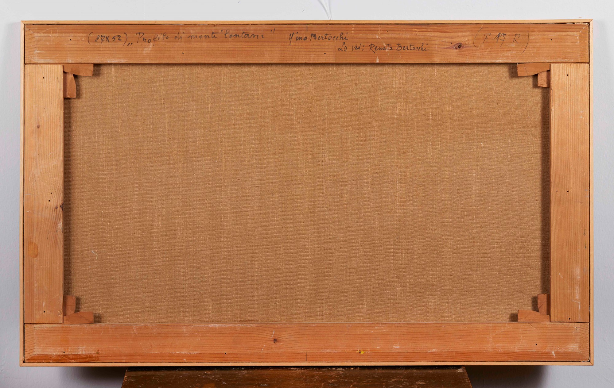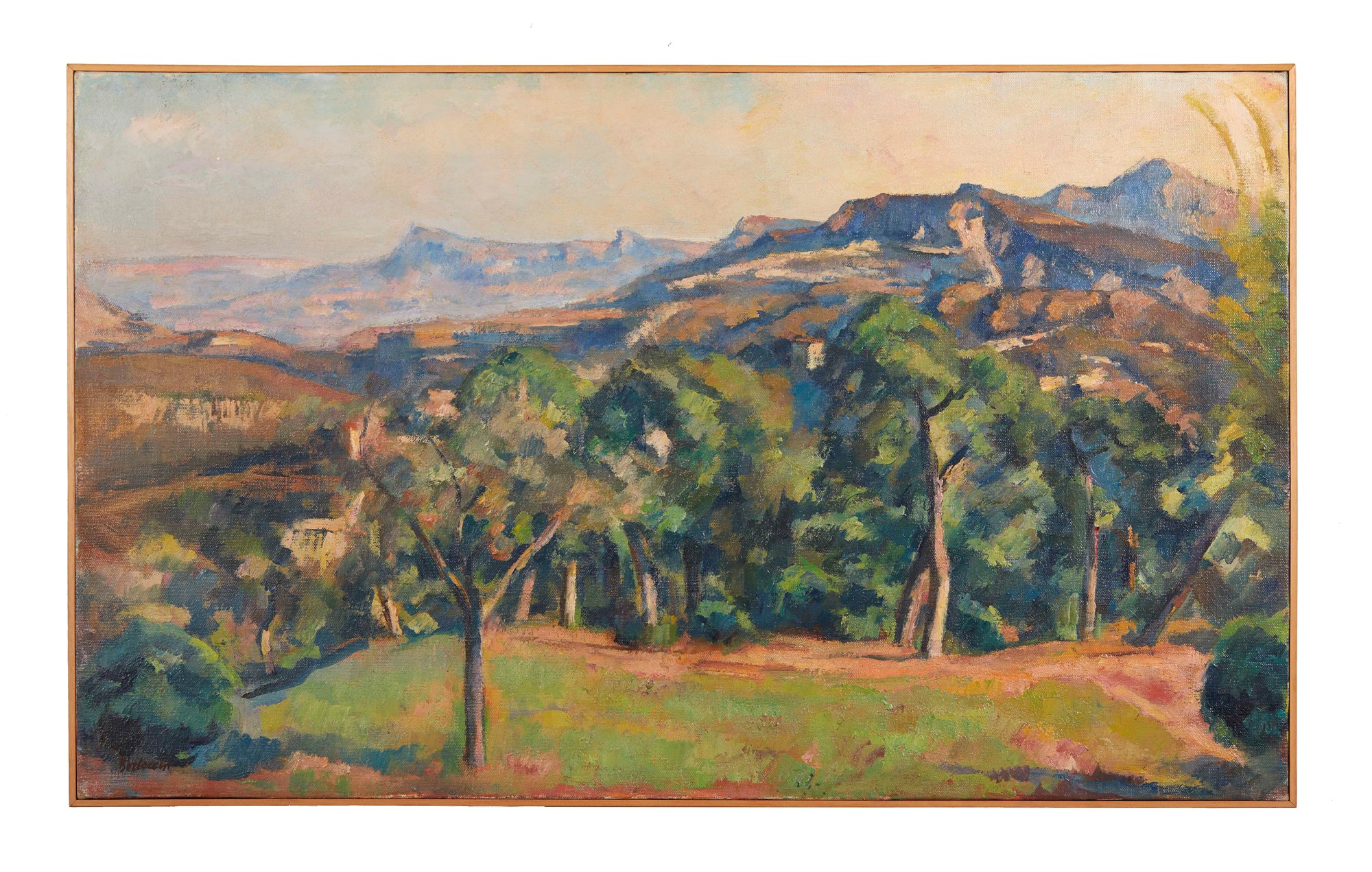 NINO BERTOCCHI (Bologna 1900 – Monzuno 1956) “Profilo di monti lontani”. Olio su tela. Cm 52x87. Opera firmata in basso a sinistra Bertocchi. Opera intitolata, firmata e datata al retro sul telaio.