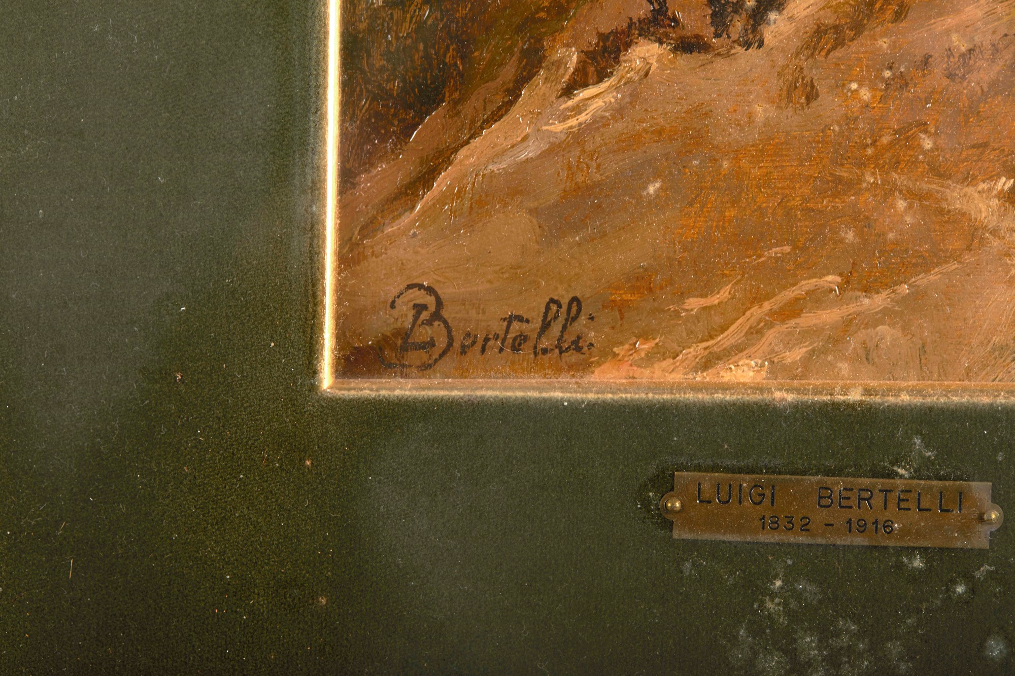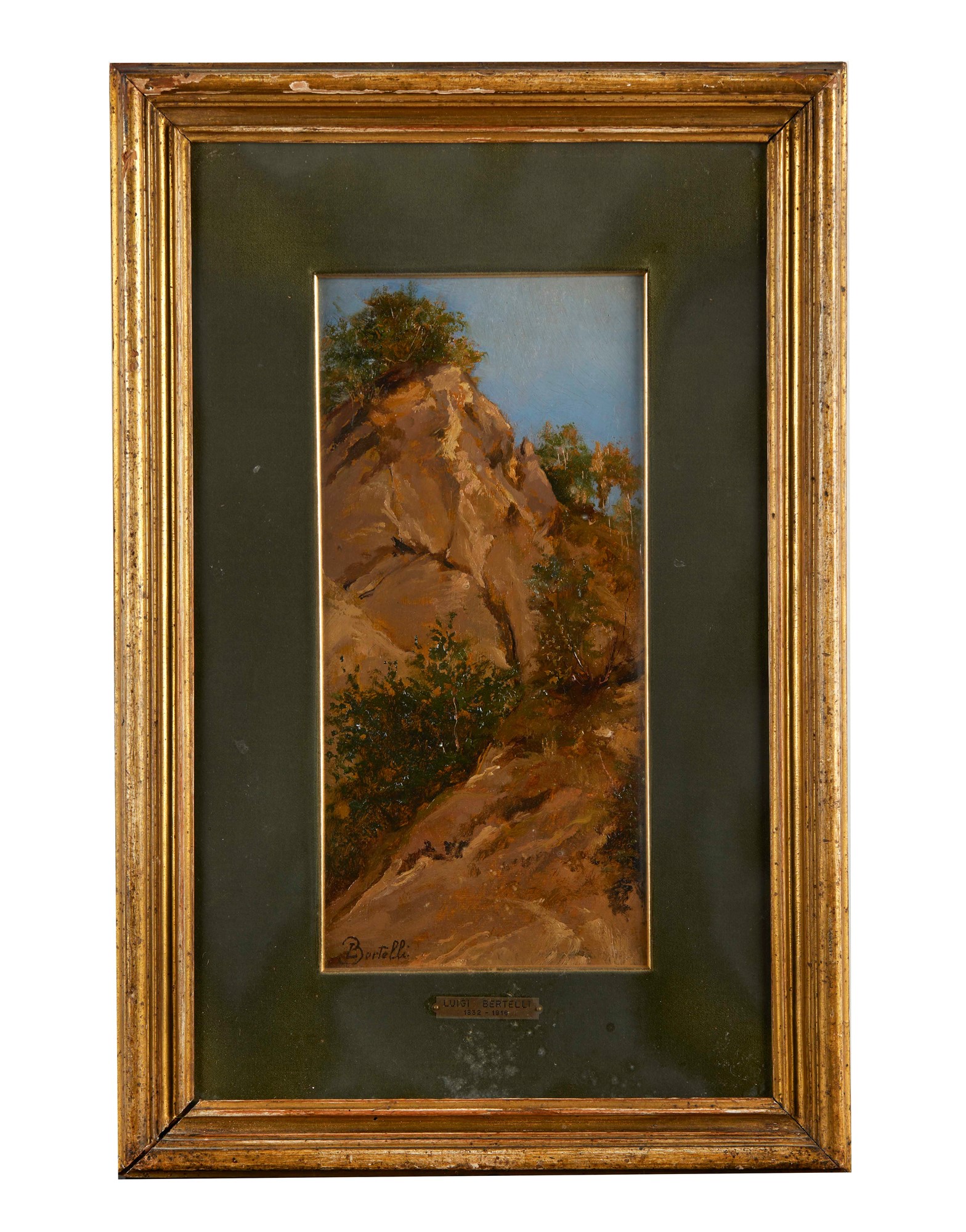 LUIGI BERTELLI (San Lazzaro di Savena 1833 - Bologna 1916) "Paesaggio". Olio su tavola. Cm 32,5x15,5. Opera firmata in basso a sinistra L. Bertelli. Al retro reca scritta per autentica a firma Giulio Fiori.