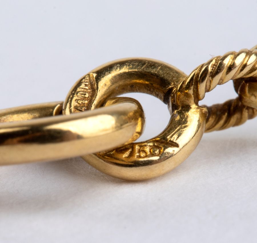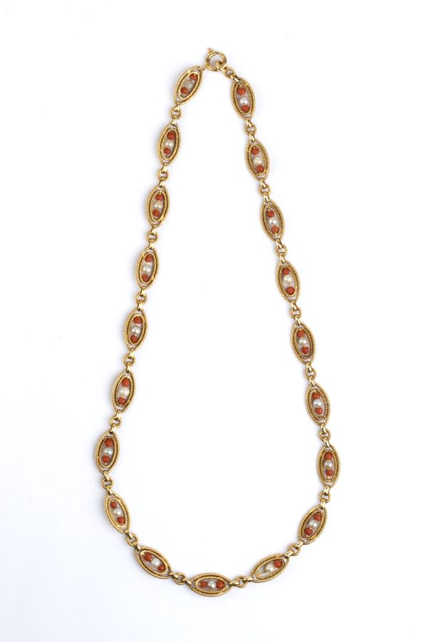 in oro giallo 18k, catena a maglie ovali con doppio motivo a cordonetto, perle e piccole sfere di corallo Mediterraneo (Corallum Rubrum).