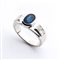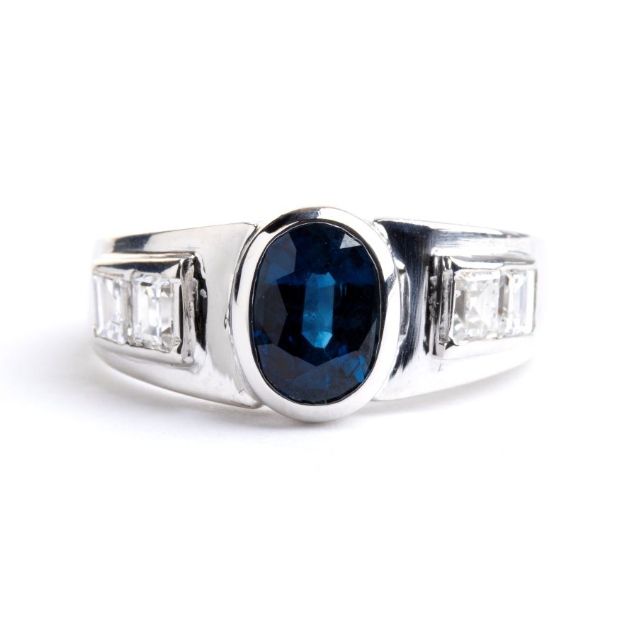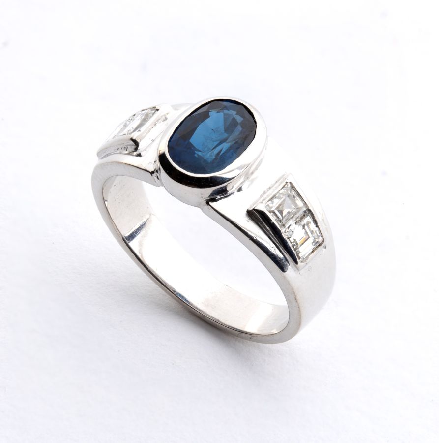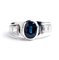 in oro bianco, incastonato con zaffiro ovale affiancato da diamanti.