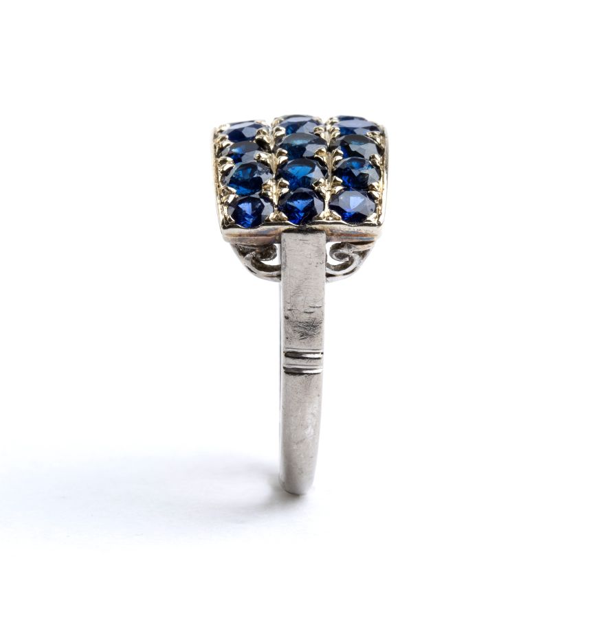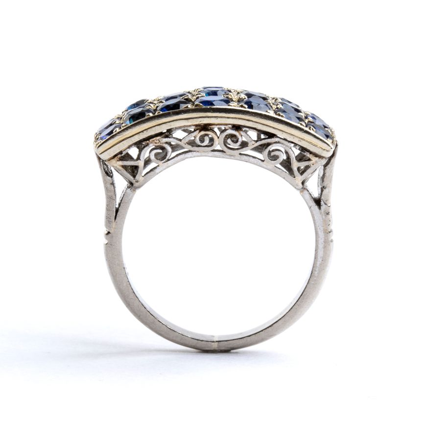 Anello a fascia in oro e zaffiri Anni '40 in oro bianco 18k, incastonato con...