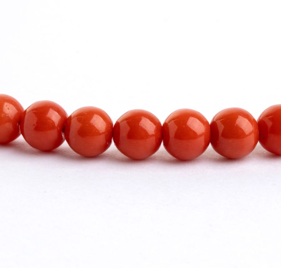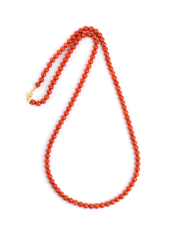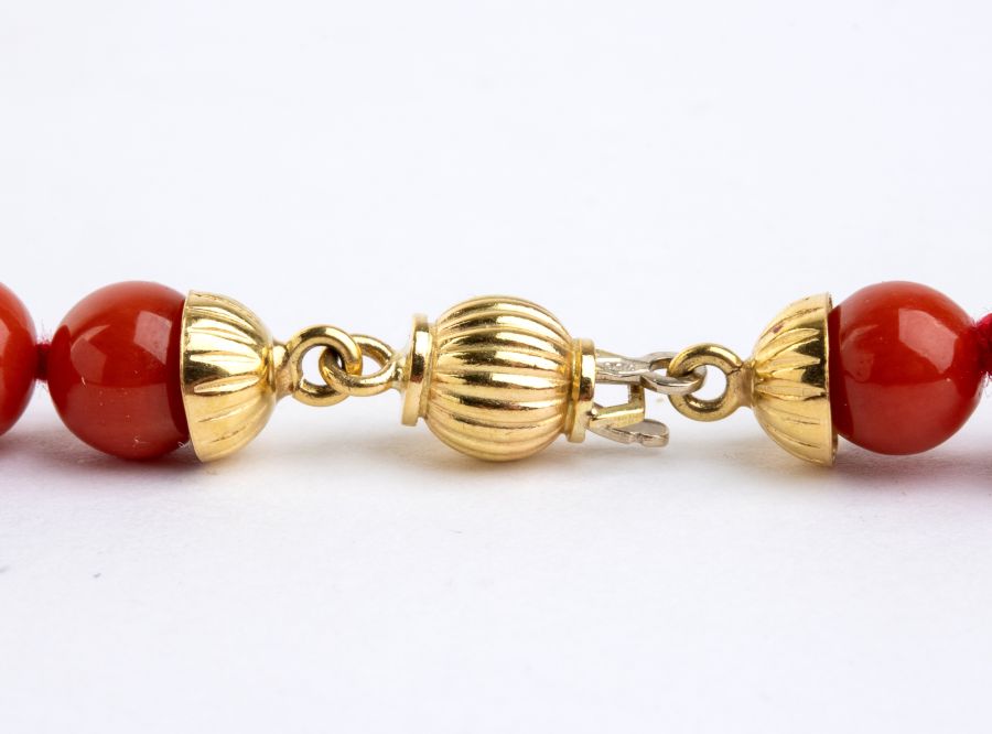 fermezza in oro giallo 18k, ad un filo di sfere di corallo Mediterraneo (Corallum Rubrum).