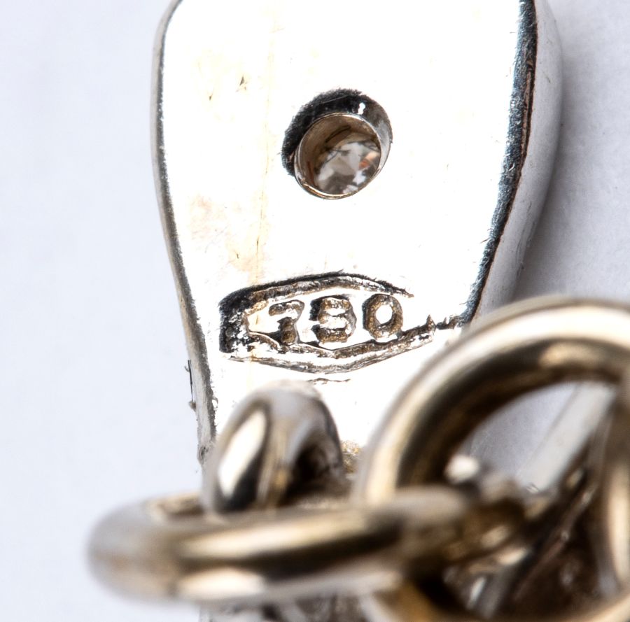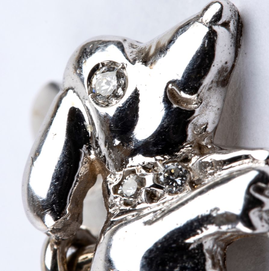 in oro bianco 18k, a forma di cane, incastonati con diamanti.