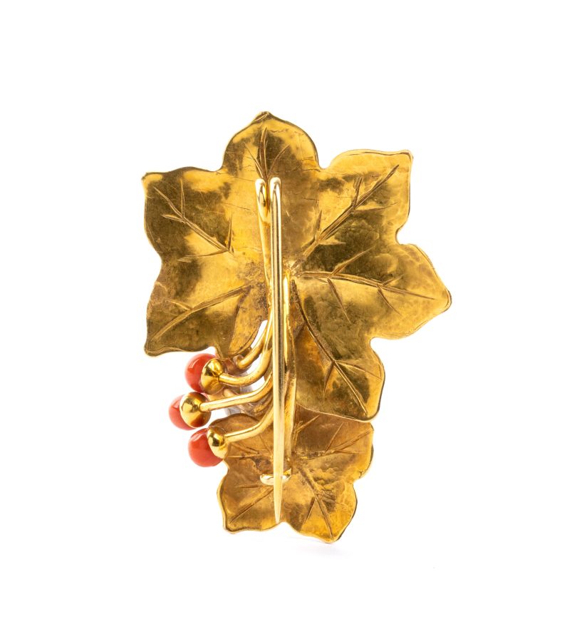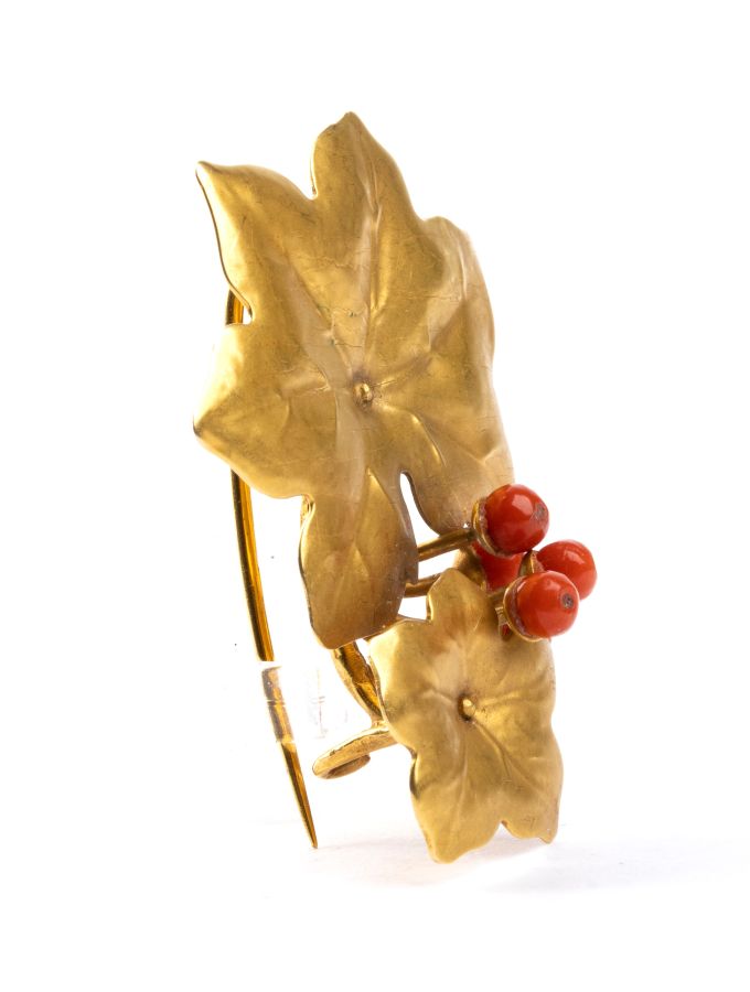 Spilla in oro con corallo Mediterraneo in oro giallo, a forma di foglie di...