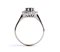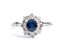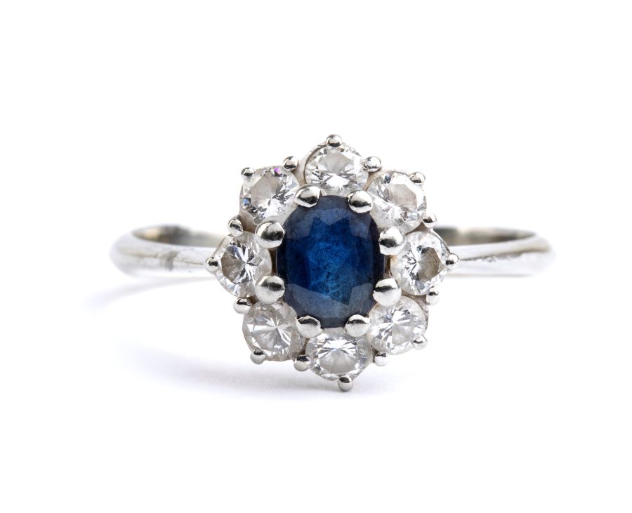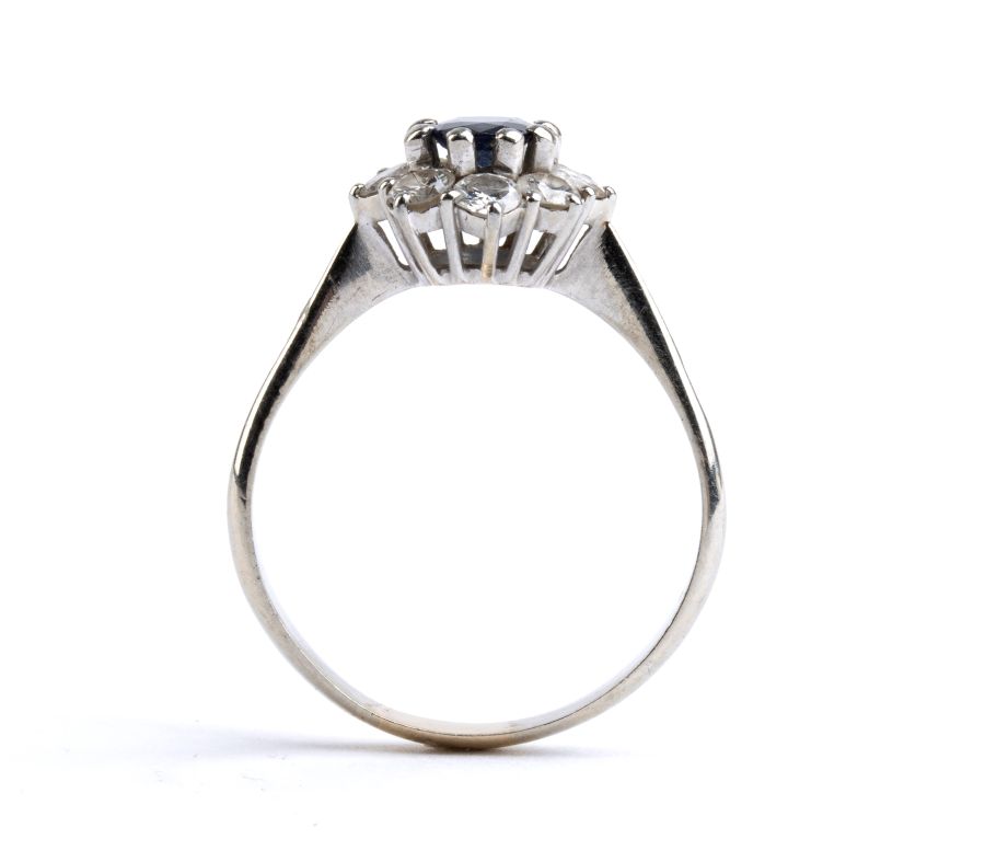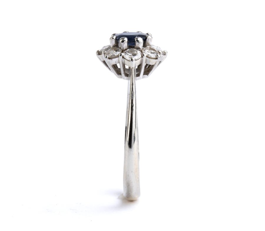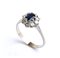 montatura a margherita in oro bianco, impreziosita da uno zaffiro contornato da diamanti.