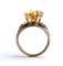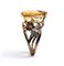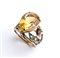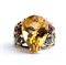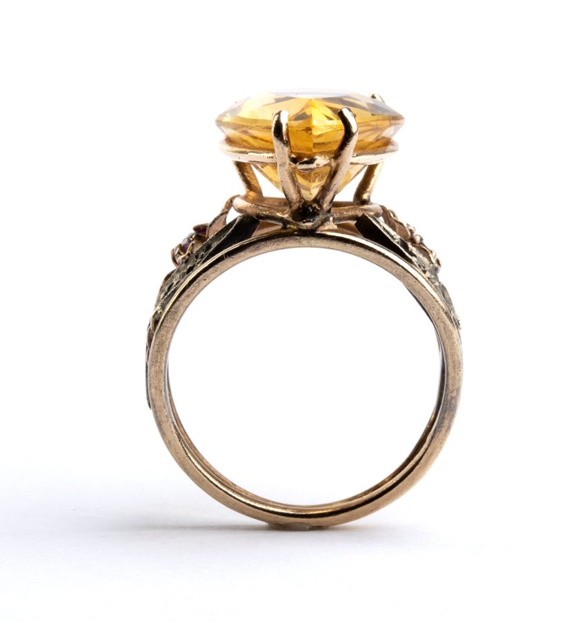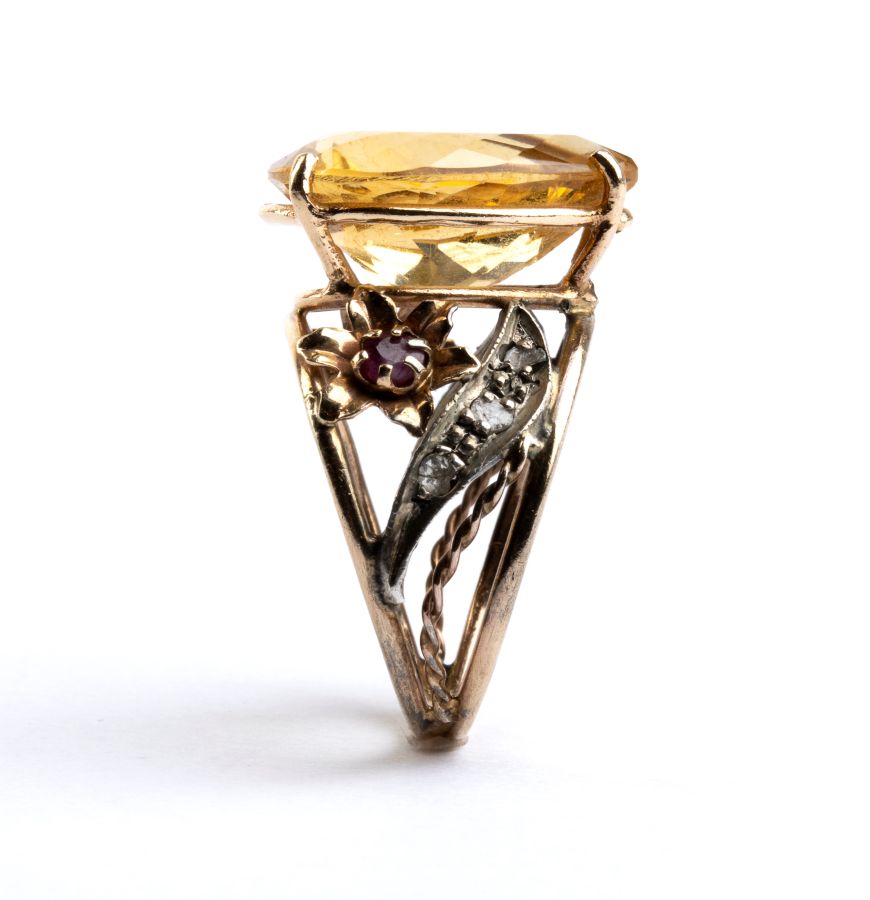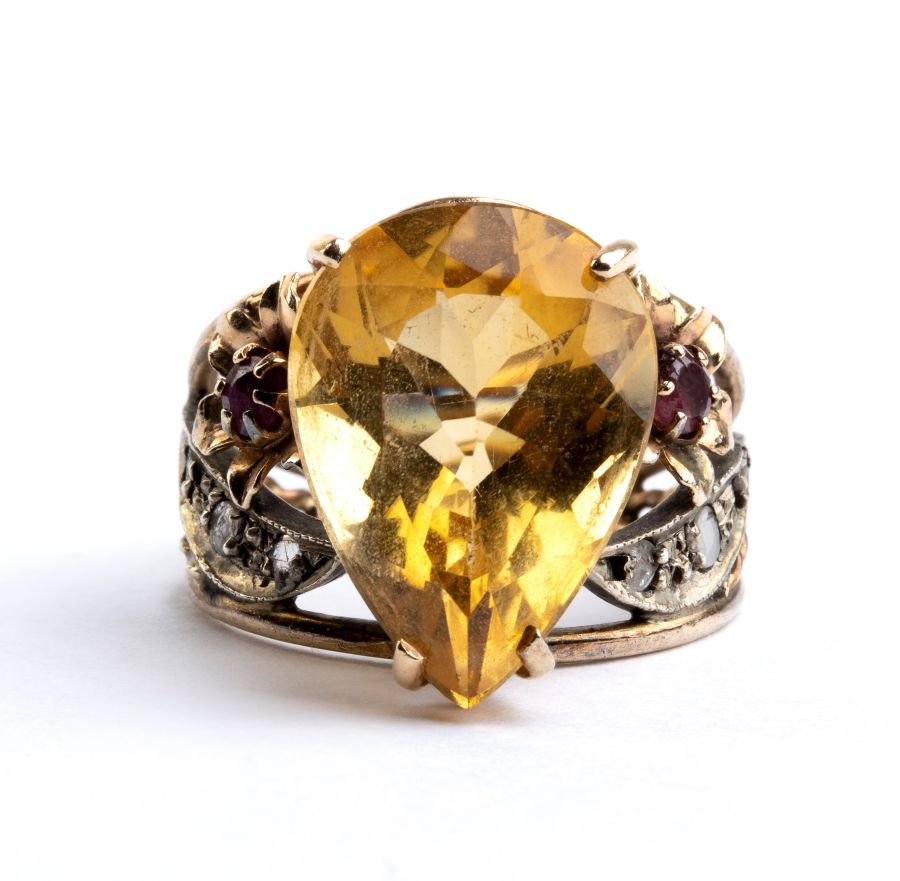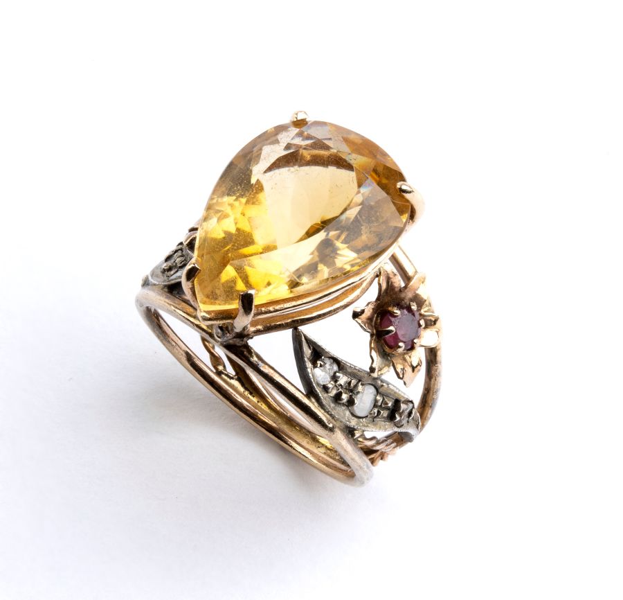 in oro giallo ed oro bianco, incastonato con grande quarzo citrino a forma di goccia, affiancato da coppia di rubini e motivo di foglie in diamanti taglio a rosa.