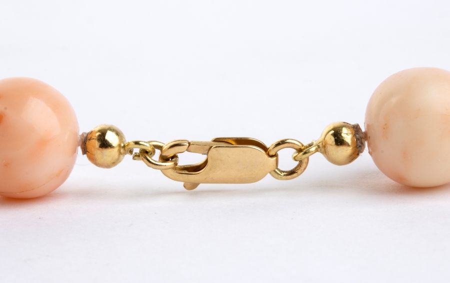 composta da un filo di sfere di corallo Deep Sea, chiusura in oro giallo.
