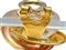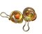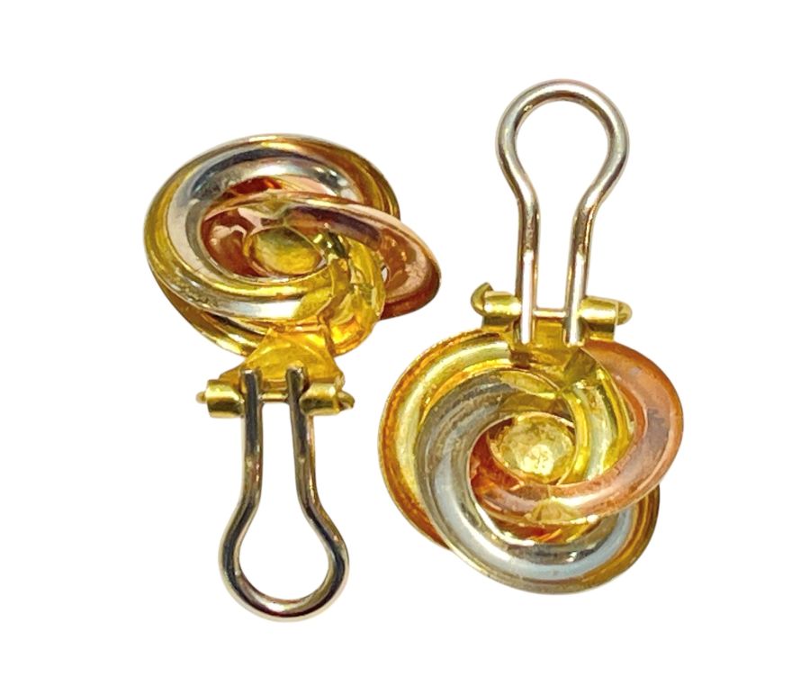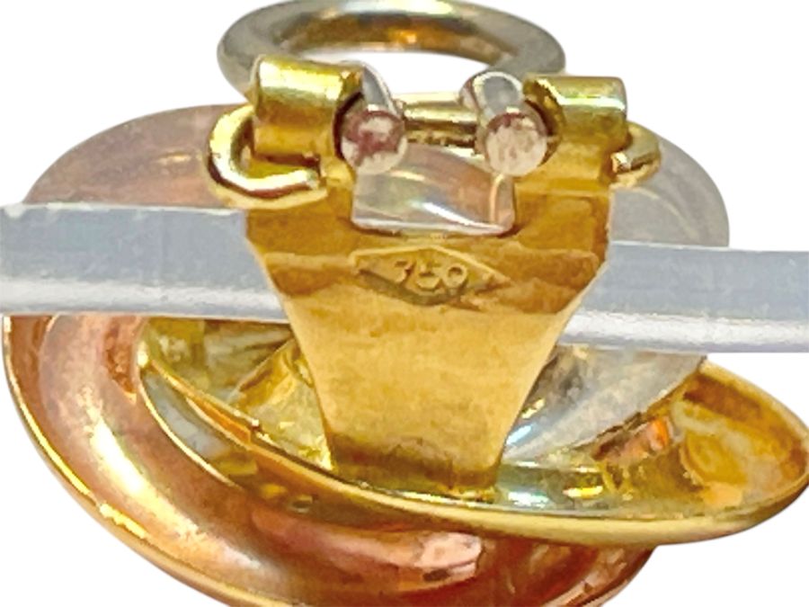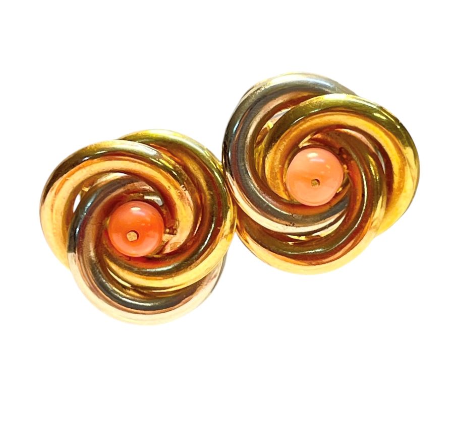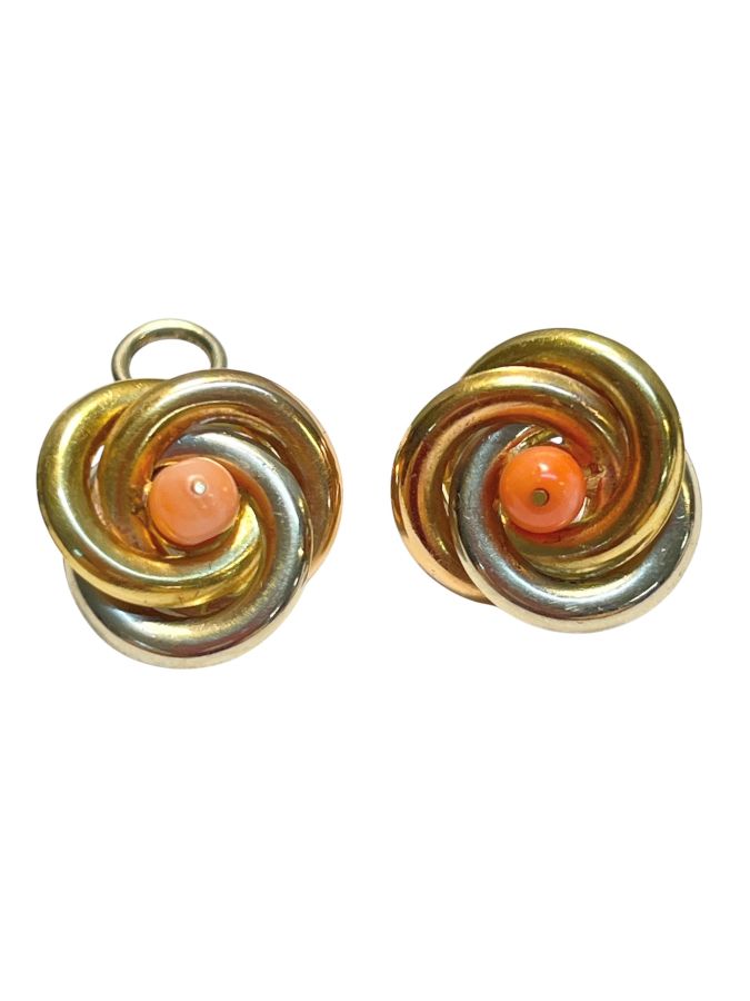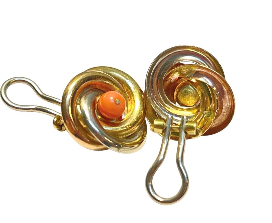 ciascuno con motivo a girandola in tre colori d'oro 18k. con piccola sfera di corallo Cerasuolo (Corallium Elatius).