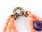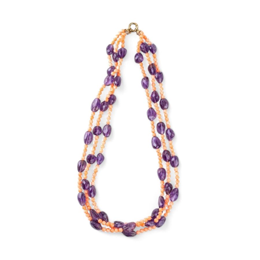 Collana in corallo rosa, ametiste e argento a tre fili di piccole sfere di...