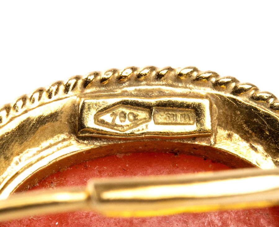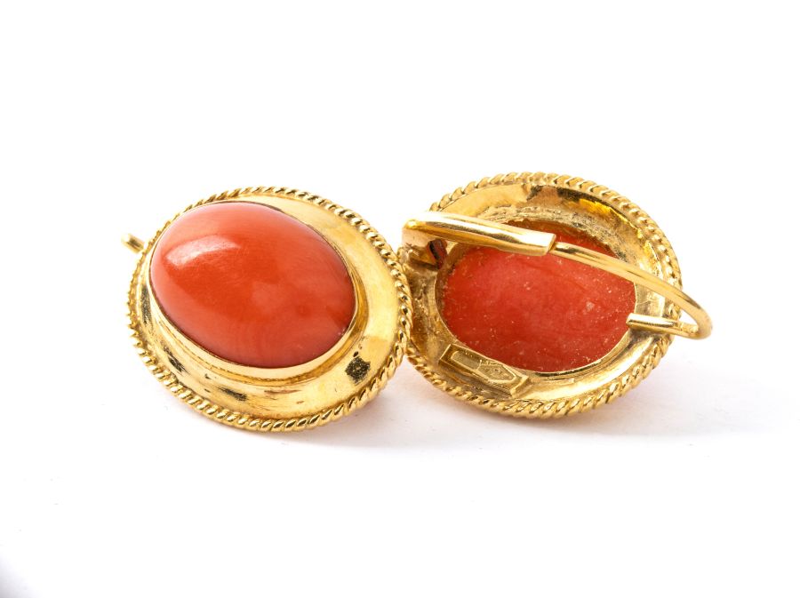 in oro giallo 18k, incastonato con cabochon ovale di corallo Mediterraneo (Corallum Rubrum), tra cornice con motivo a cordonetto.