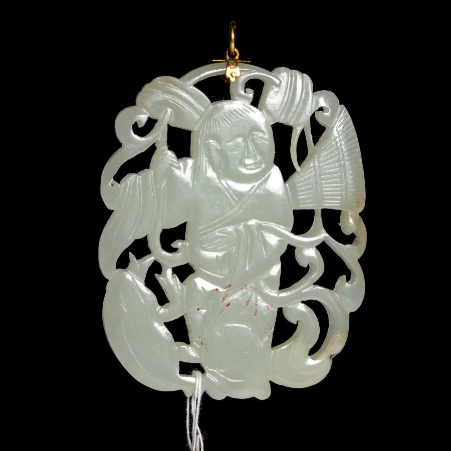 Pendente in giada con lastra di giadeite traforata Dimensioni 6 x 4.5 cm....