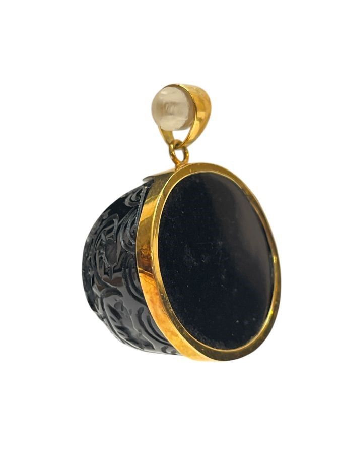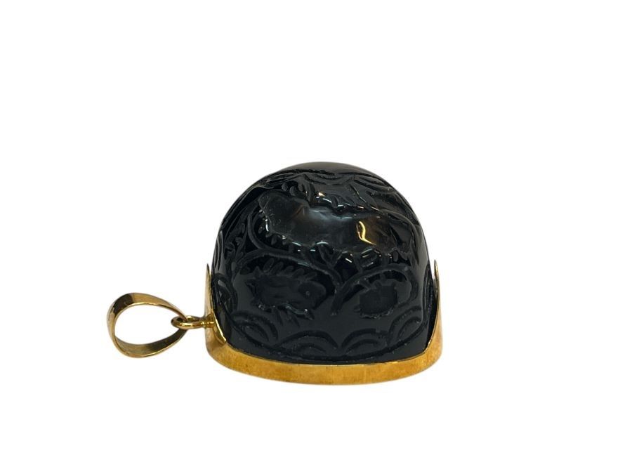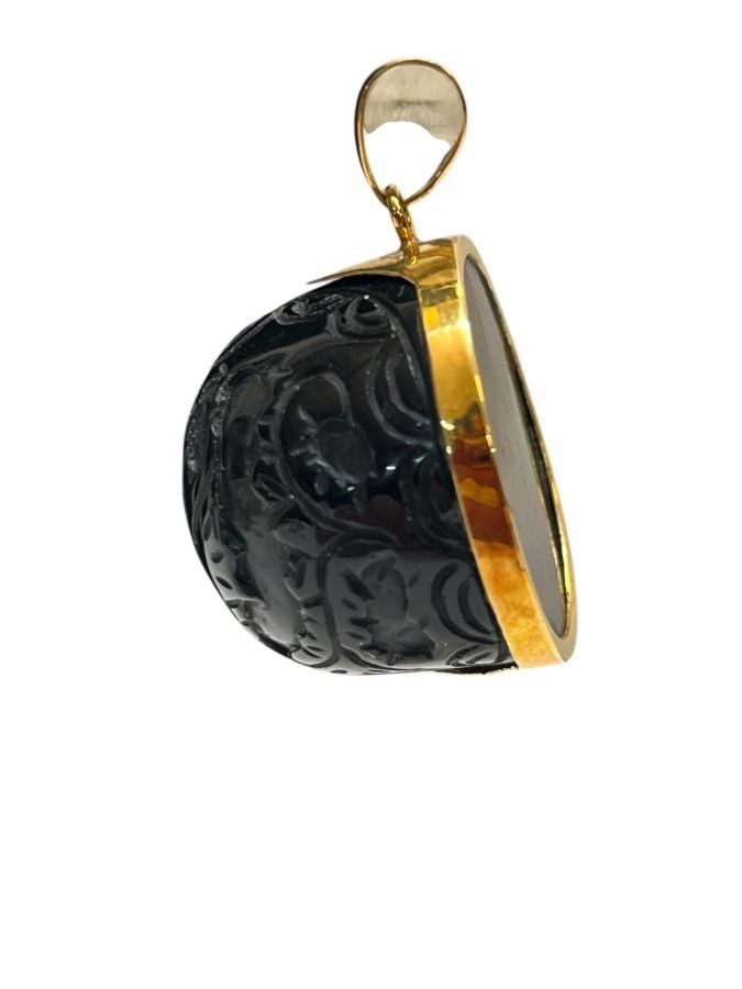 Pendente con agata di forma sferica, incisa con motivi floreali, montatura in...