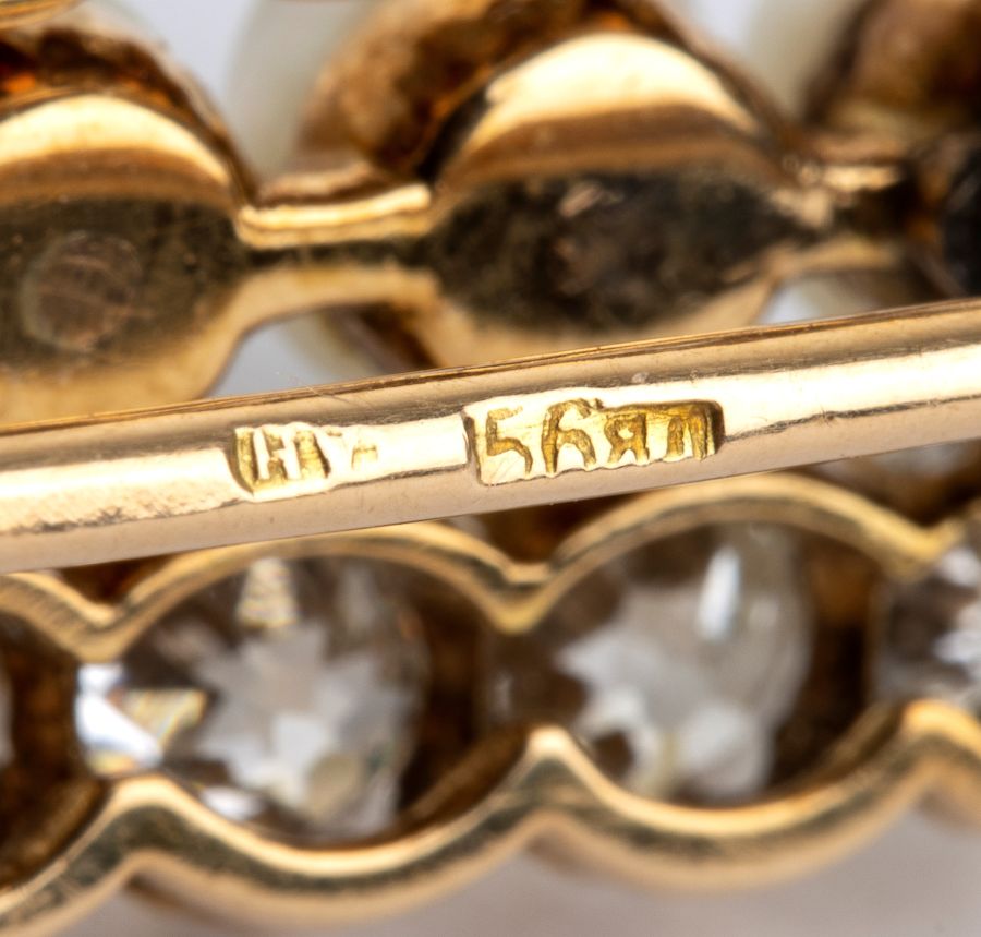 Punzonata con i marchi russi per l'oro al titolo di 14k.