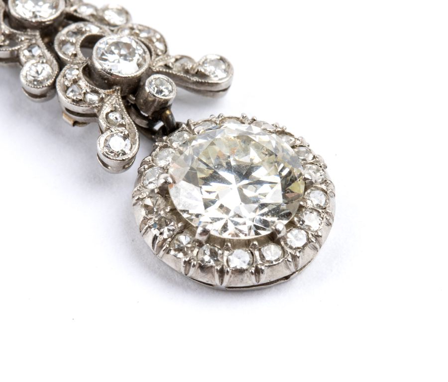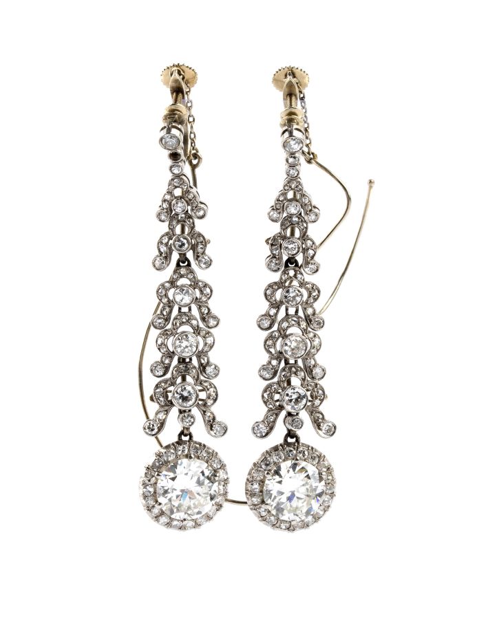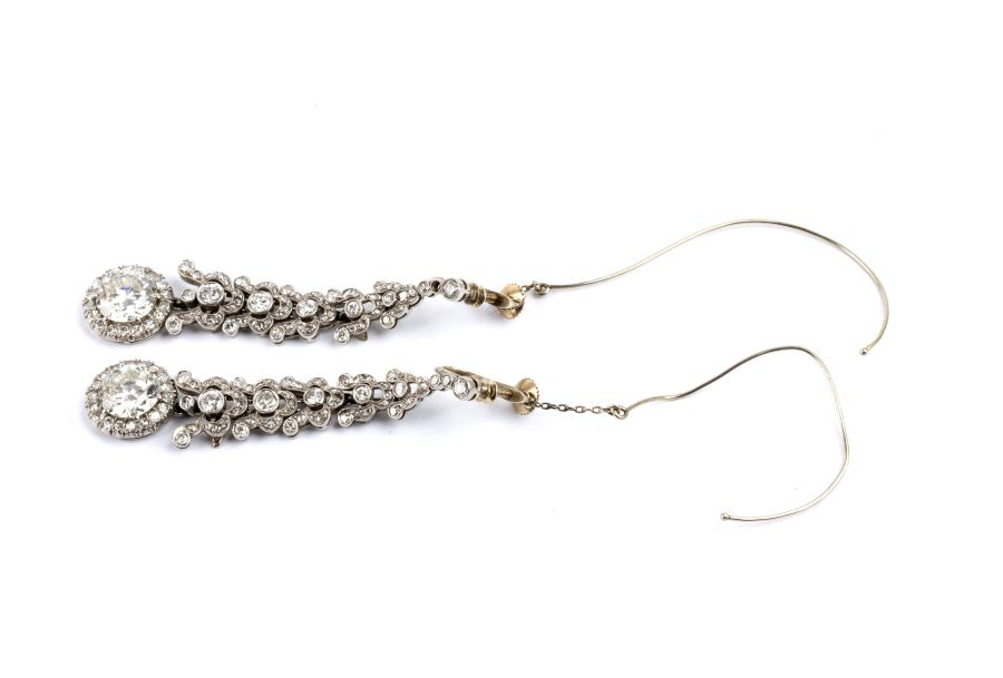 in platino, decorati con motivi floreali stilizzati, e impreziositi da diamanti taglio vecchio europeo, taglio huit-huit e taglio a rosa, Gli orecchini possono essere smontati in tre parti ed indossati in differenti lunghezze.